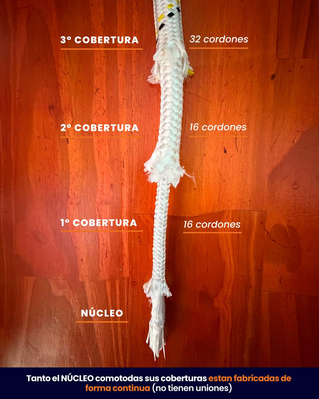 🦾 Núcleo sólido de innumerables hilos rectos, primera cobertura 16 cordones, segunda cobertura 16 cordones y tercera cobertura 32 cordones, desarrollado para brindar máxima resistencia a la tensión.